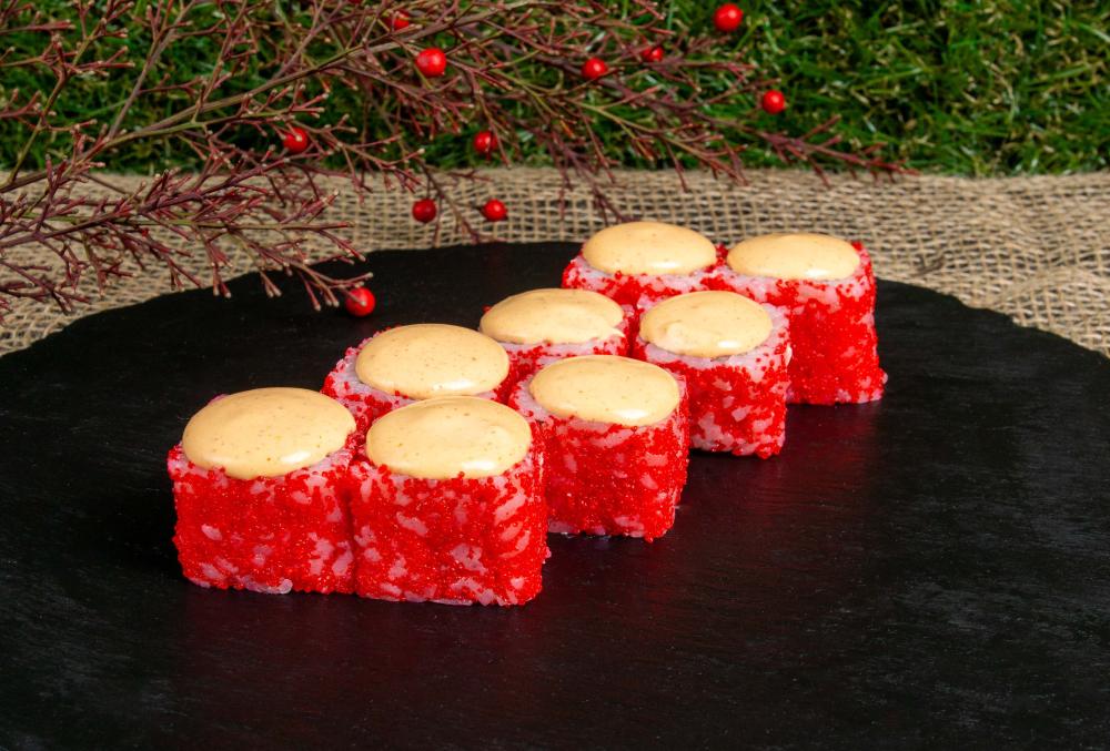 Рис, креветка, авокадо, сыр, панировка, соус лава